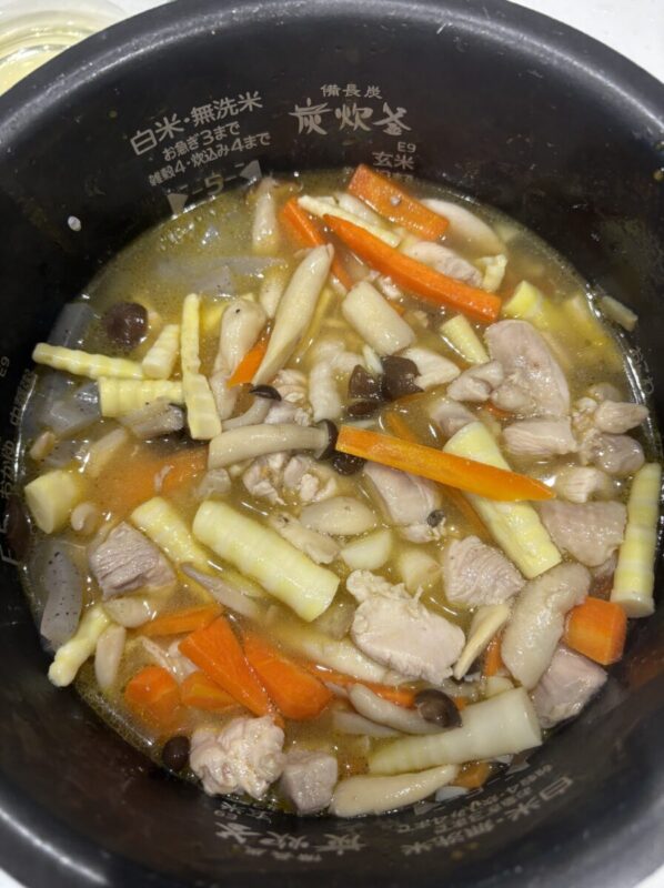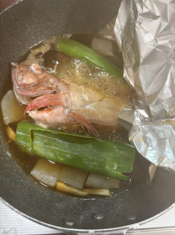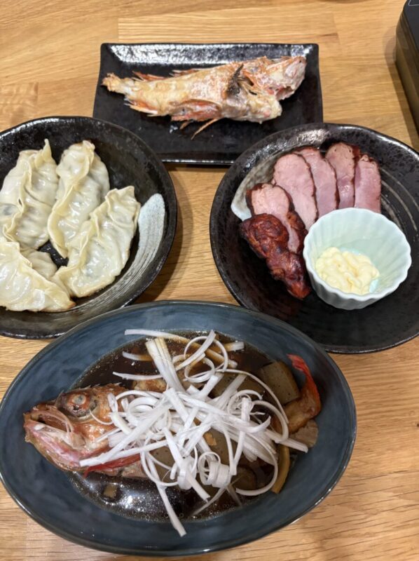 鶏の炊き込みご飯、キンキンの煮つけ、キンキンの塩焼き、自家製チャーシュー、万福風ジャンボ餃子(前日の)、湯豆腐