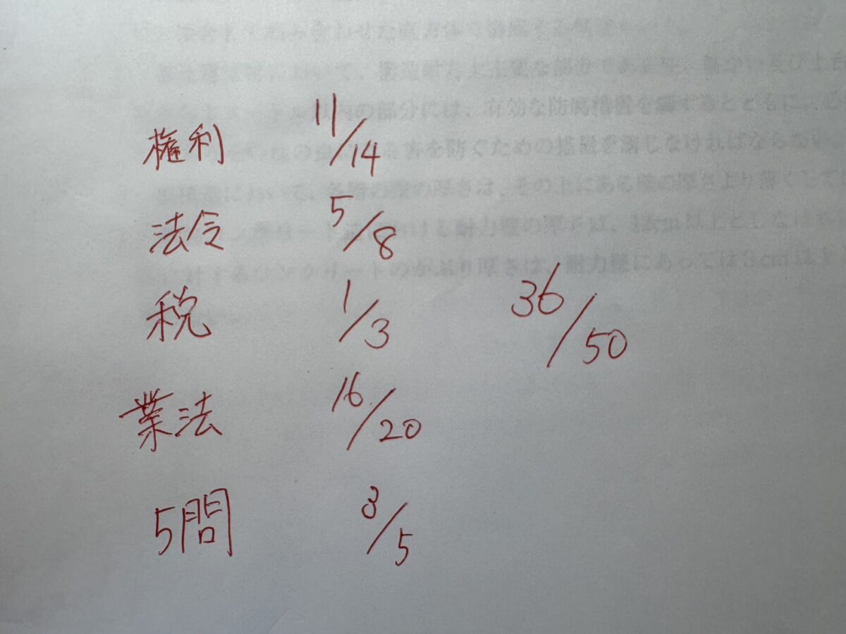 結果からお話すると36点で、権利関係が思いのほか点数が伸びてくれましたが、例年得点源とされている宅建業法が個数問題の大幅な増加による難化により伸び悩む結果となりました。