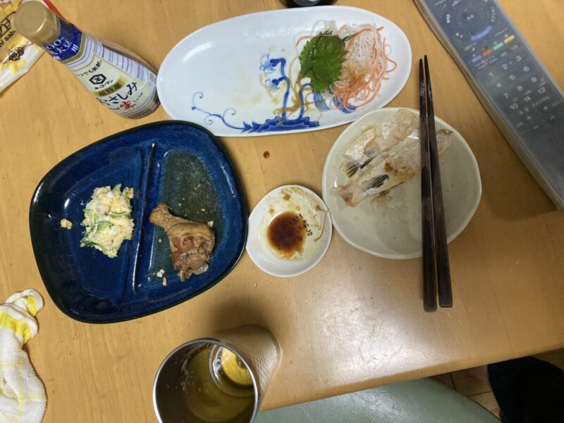 ホタテ・サーモンの刺身(故郷納税での返礼品)芋サラダ・サーモンのハラス等々