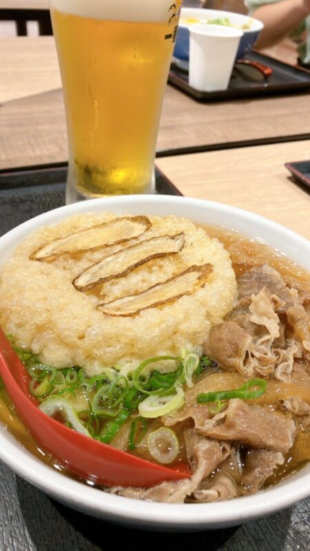 ごぼてん肉うどん + 🍺  出汁がヤバい💦 うんまい😋