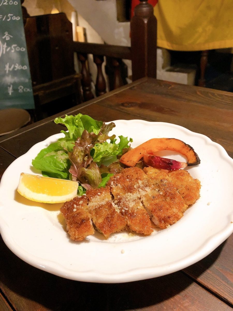 ミラノ風カツレツ(添えられた焼野菜といちじくが絶品!!)