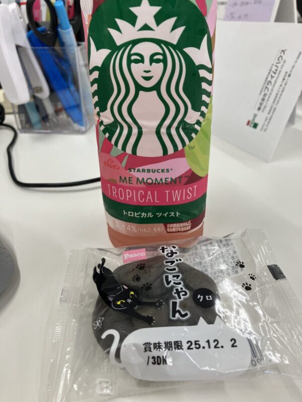 ママからもらったスタバのジュースと三浦さんからもらったなごにゃんで今日の英気を養います