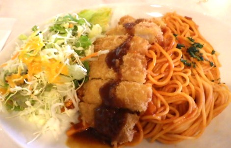 やっと席を見つけ注文したのはナポリカツです。ボリュームたっぷりでした。