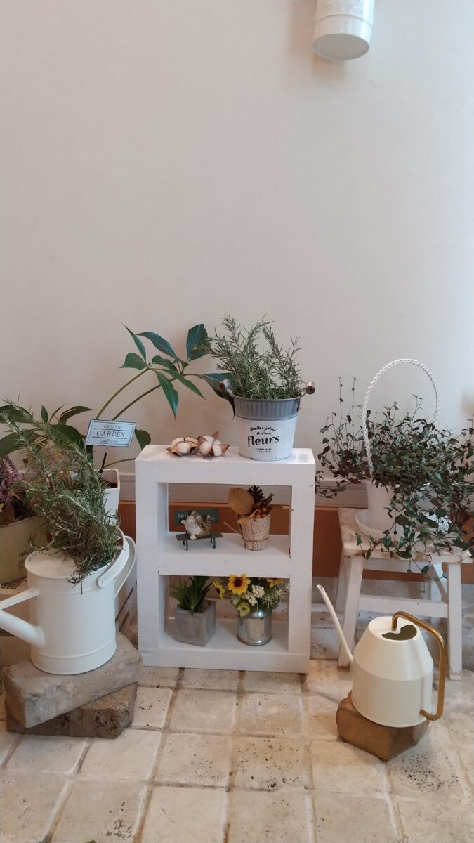 仁井田の朝市で購入した木のフレームシェルフをホワイトでペンキ塗りして、フラワーシェルフに仕上げました🍀