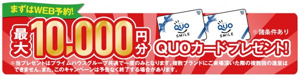 ❶予約フォーム下部に掲載している「WEBアンケート」に必ずご回答いただくこと。❷「1万円獲得条件」は予約フォーム下部に掲載しております。必ずご確認下さい。❸当プレゼントはプライムハウスグループ共通で一度のみとなります。❹複数ブランドにご来場頂いた際の複数回の進呈はできません。(このキャンペーンは予告なく終了する場合があります。)