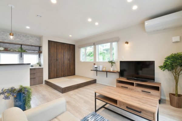 リビング隅に設けた2帖の畳スペース。段差に腰かけてくつろげるのも、小上がり和室の人気の理由の一つです。大きなクローゼットは、本や漫画をたっぷり収納できるため、ゆったり読書スペースとして活用したりと、用途は様々です。