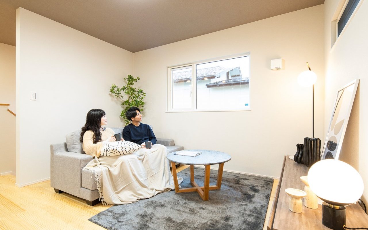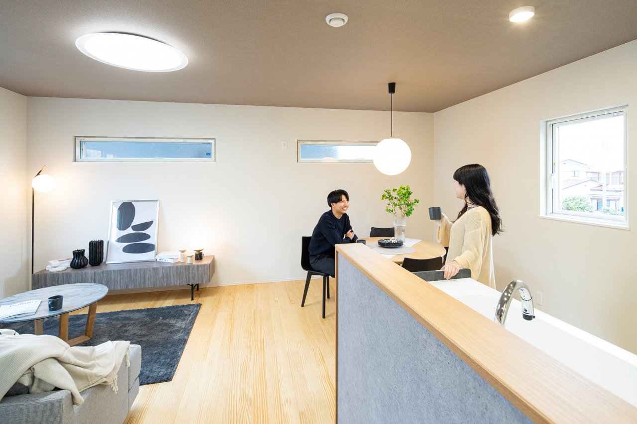 平ラインが美しい外壁と、木目の玄関ドアが印象的なファサード。シンプルな形状の中に、程よい素材のコントラストを効かせた上質な佇まいです。縦長のスリット窓がデザインのアクセントとなり、外からの視線をほどよく遮りながらも自然光を取り込む工夫も。プライバシーとデザイン性を両立した、洗練の外観です。