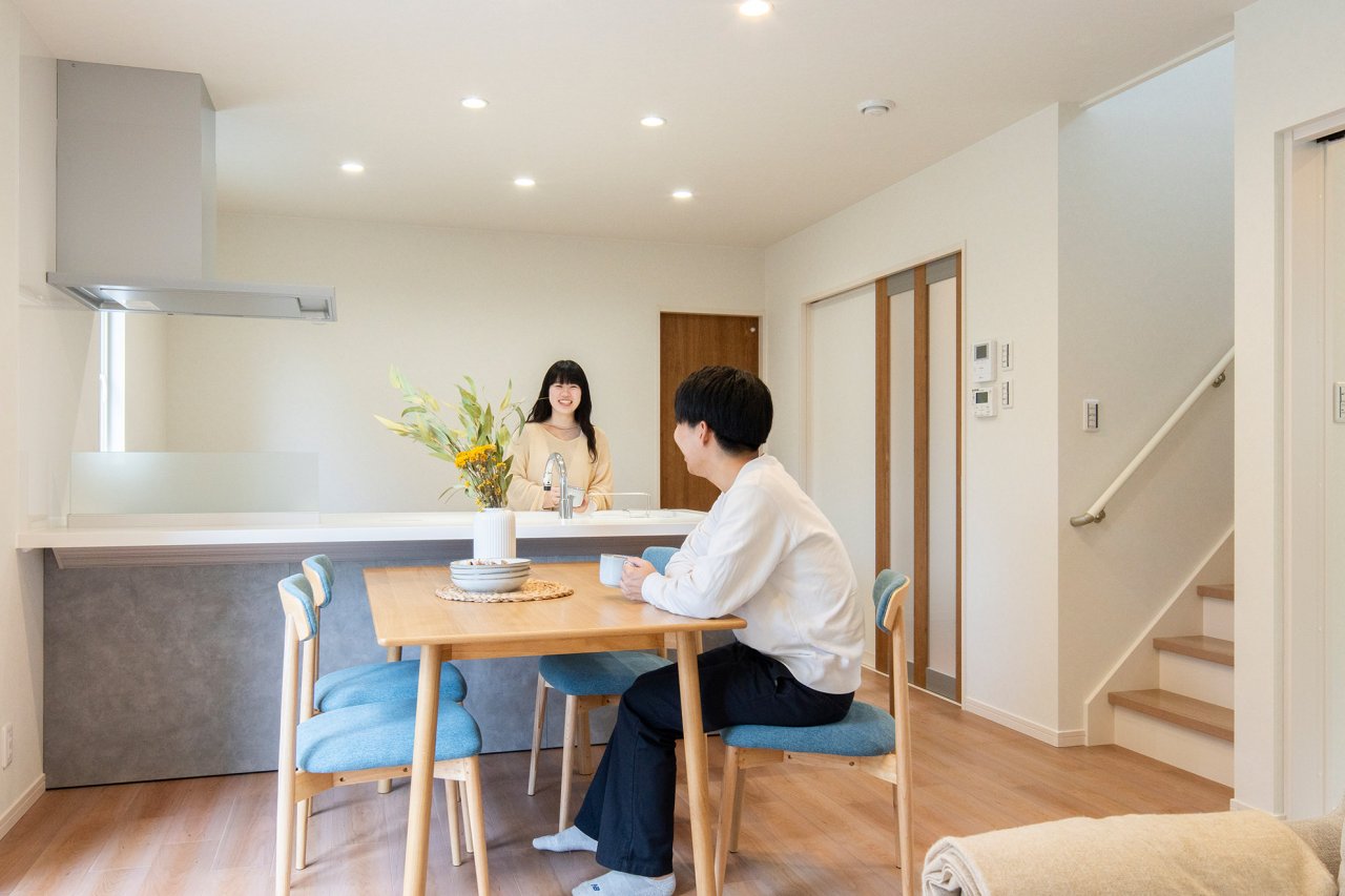 右手にキッチン、左手にリビングと、家族が自然に集まる配置になっています。