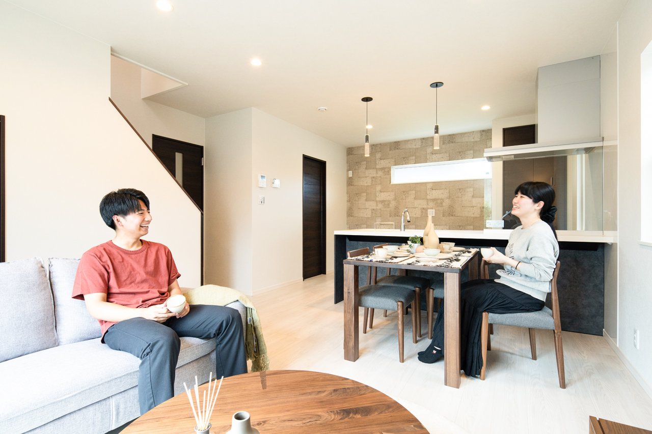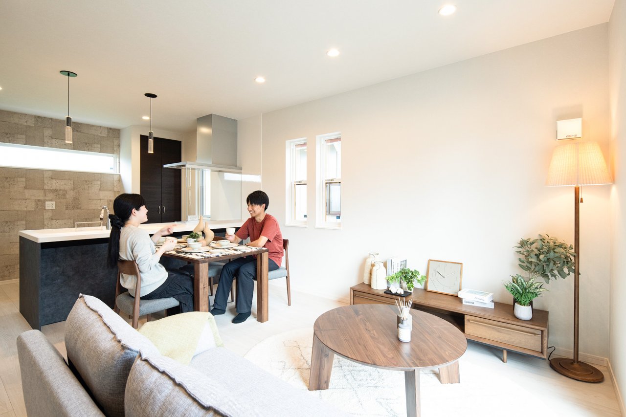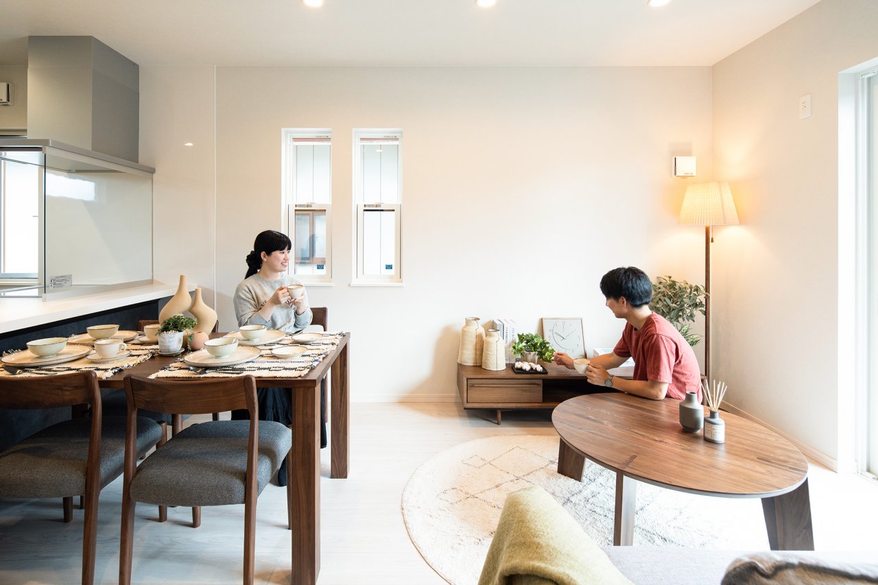 家具一つひとつが主役になれるよう選定されたインテリア。リビングとダイニングの視線が自然につながり、家族の時間がゆるやかに流れる空間に仕上げました。