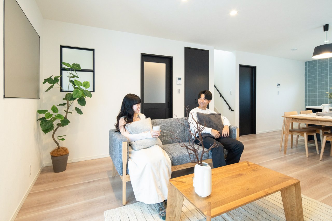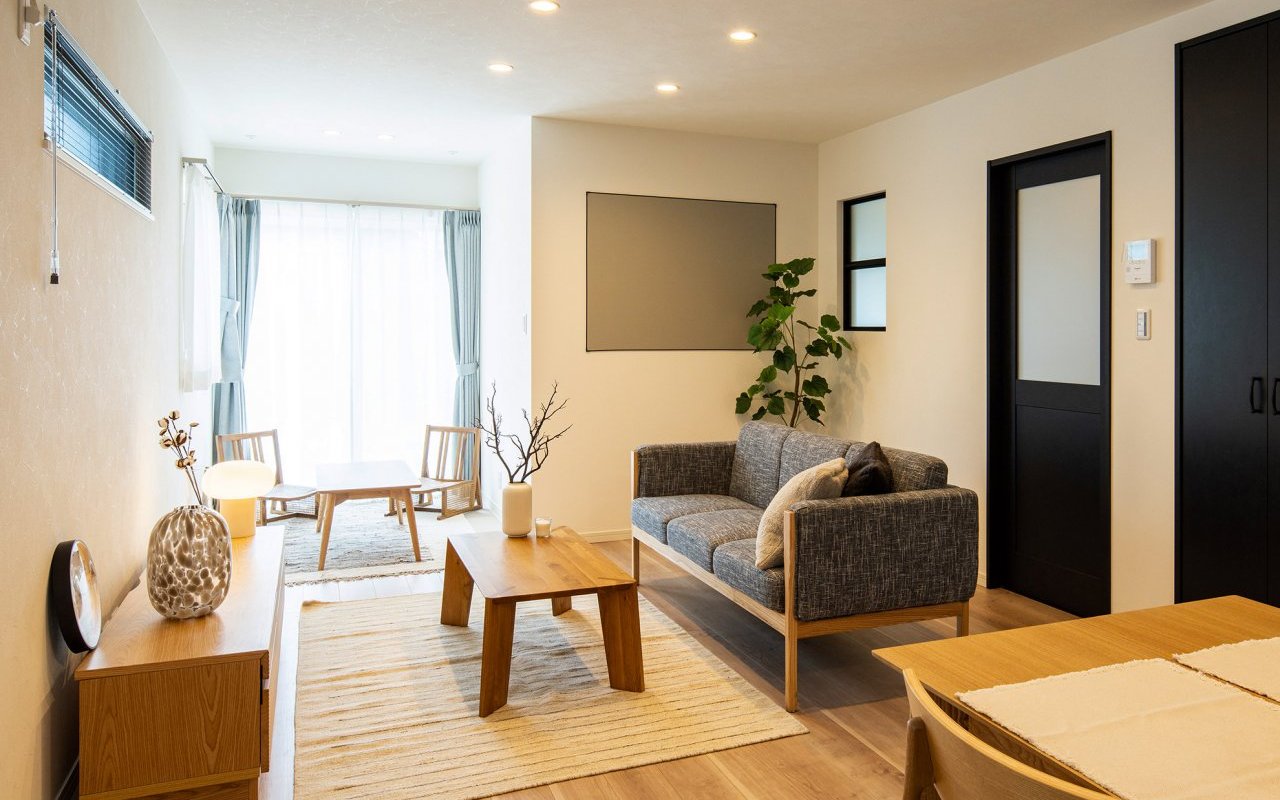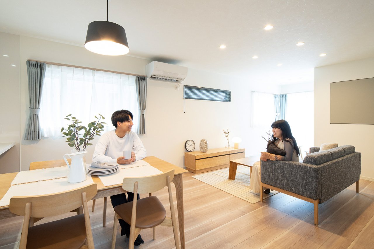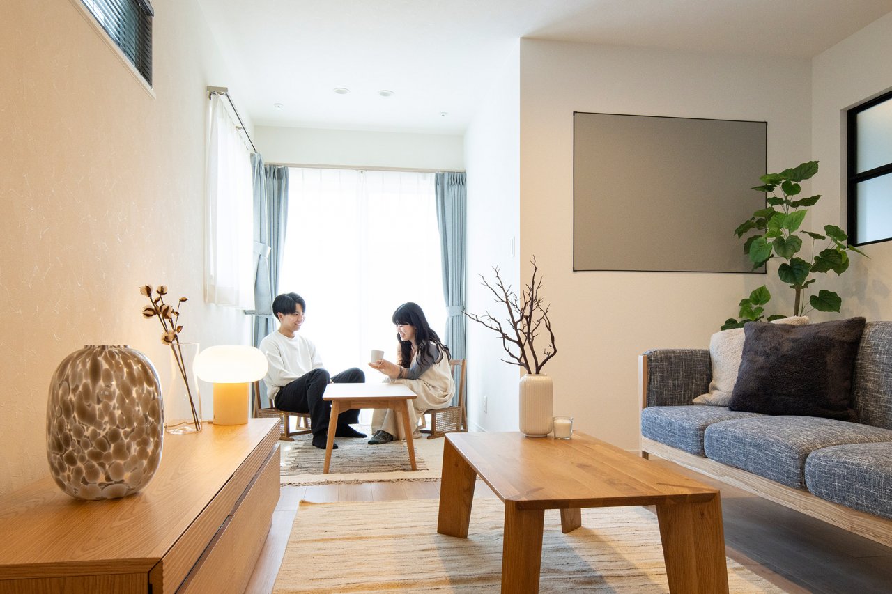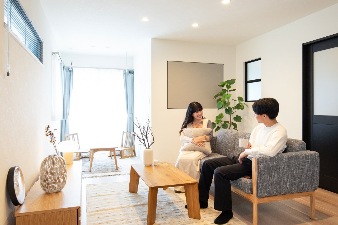 無印良品のライフスタイルを彷彿とさせる、余白を活かしたリビング。人や家具が主張しすぎず、自然と会話やひとときを楽しめる穏やかな空間に仕上げました。