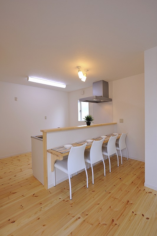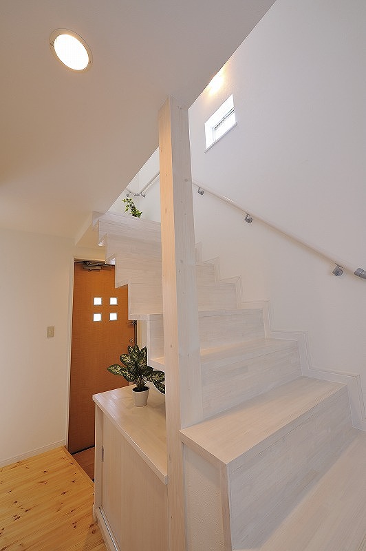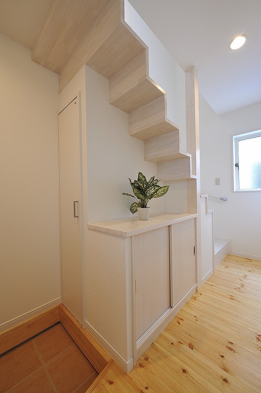 外観はシンプルに、内装は自然素材をふんだんに使用しました。 玄関ホールから見えるさりげないオープン階段がおしゃれに差をつけます。