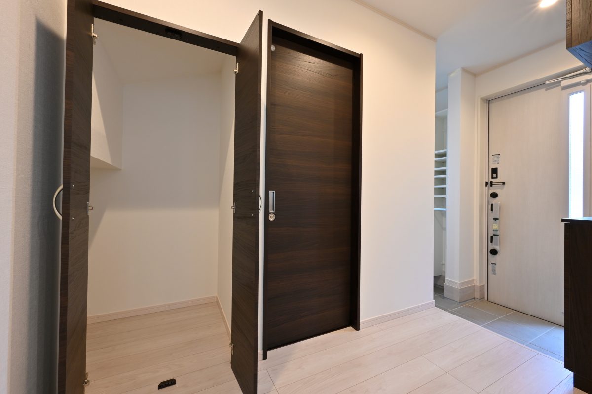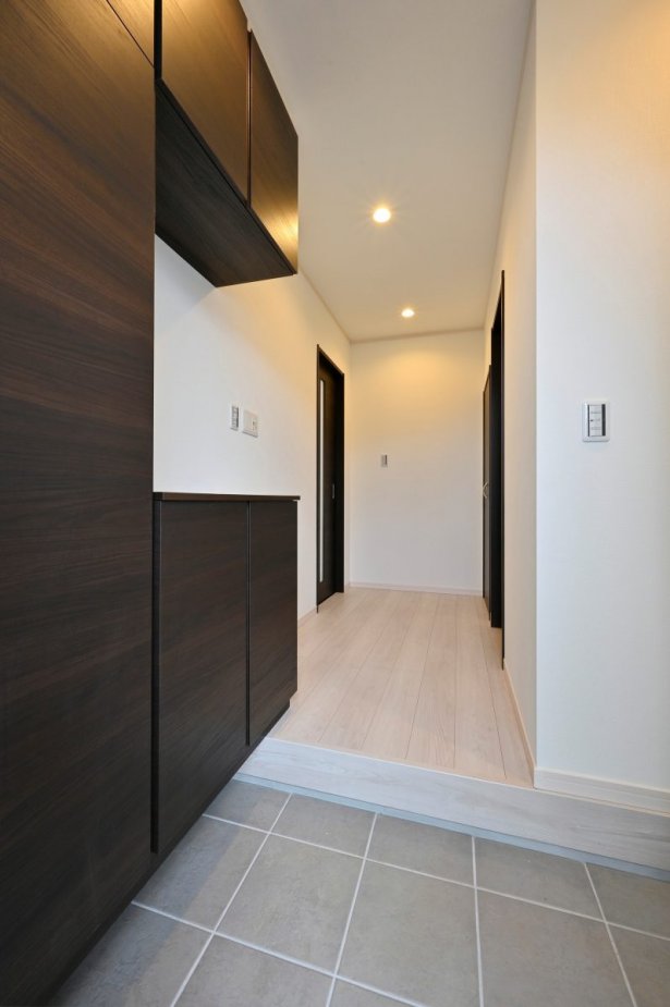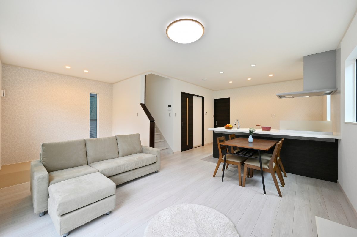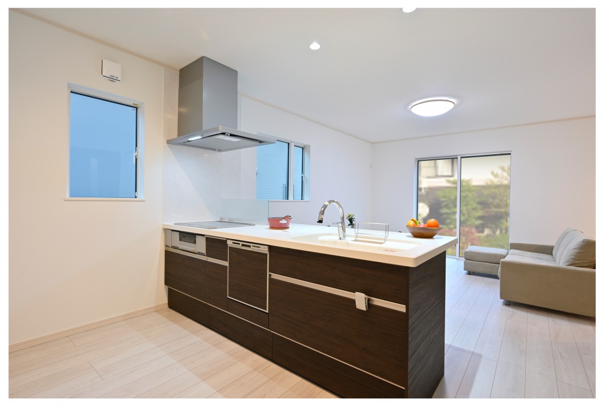 窓が多いことにより、明るく、開放感のある空間に。 ホワイトをベースに、戸やキッチンにはブラウンを使い、メリハリのあるデザインになりました。 WIC、シューズクローク、小棚収納などもあり、機能性も抜群です。