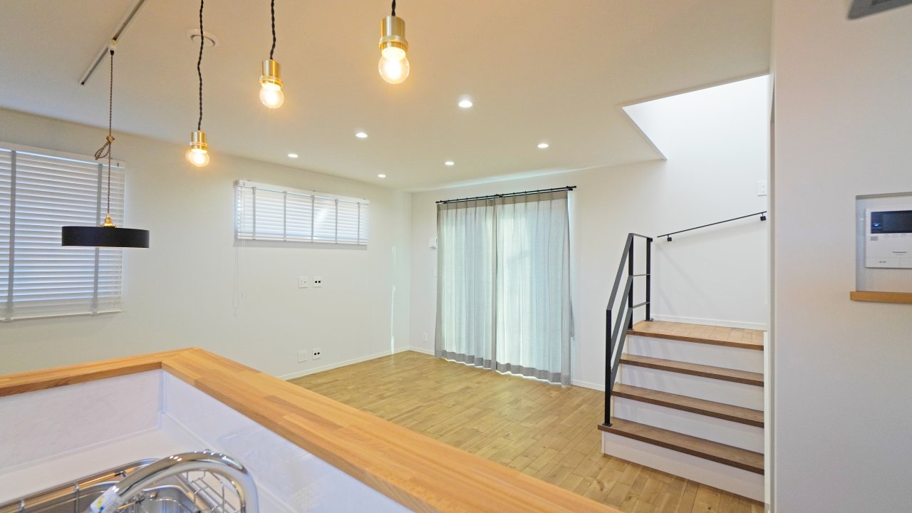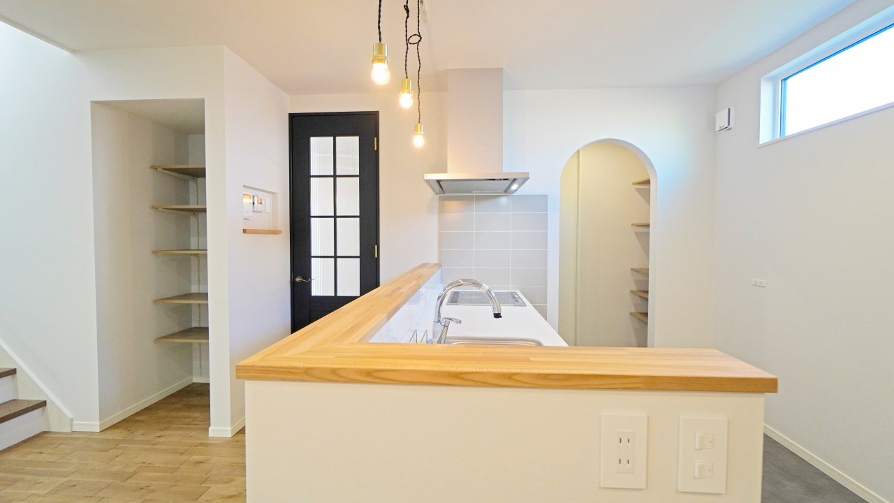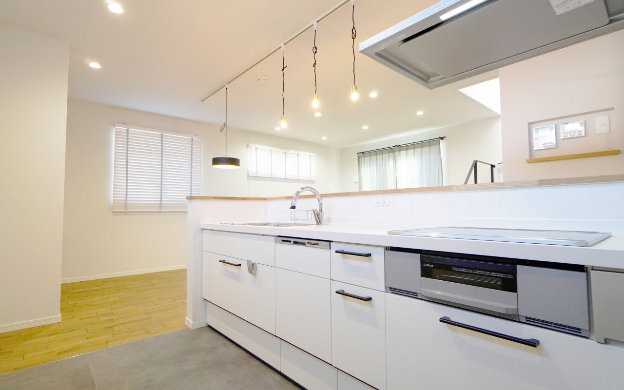 可愛いペンダントライトが映える真っ白なシステムキッチン。対面式キッチンなので、家事をしながら家族の様子が見える、とっておきの場所。