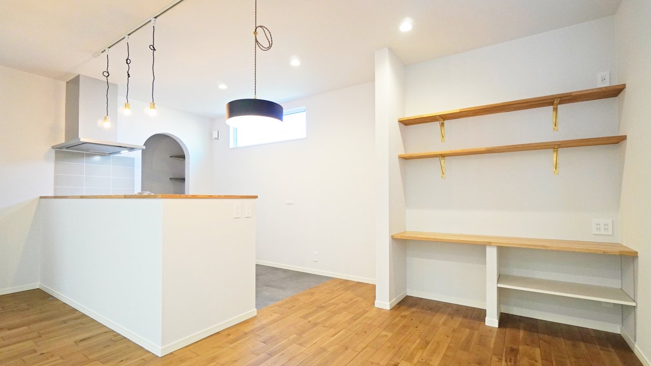 作りたい幅や奥行に対応できるのが、造作カウンターのメリットです。 また、インテリアに合わせて作るので統一感が出ます。今回は、収納スペースや飾り棚もプラス。より使い勝手の良いスペースになりました。
