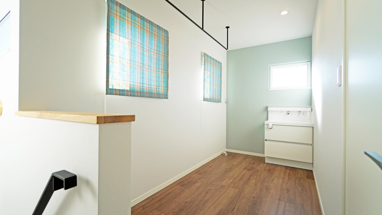 風通しも良く、陽の光もたっぷり取り込む2階ホールは、洗濯を干すための専用スペースに。各居室へすぐ取り込むこともできるため、洗濯家事の効率がアップします。天気の悪い日でも洗濯物を干せる、超便利なスペースです。