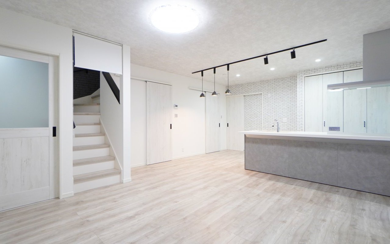 階段の壁を一部オープンにする事で空間が繋がり、開放的なリビングになりました。階段横のアクセントクロスで空間が華やかになりました。