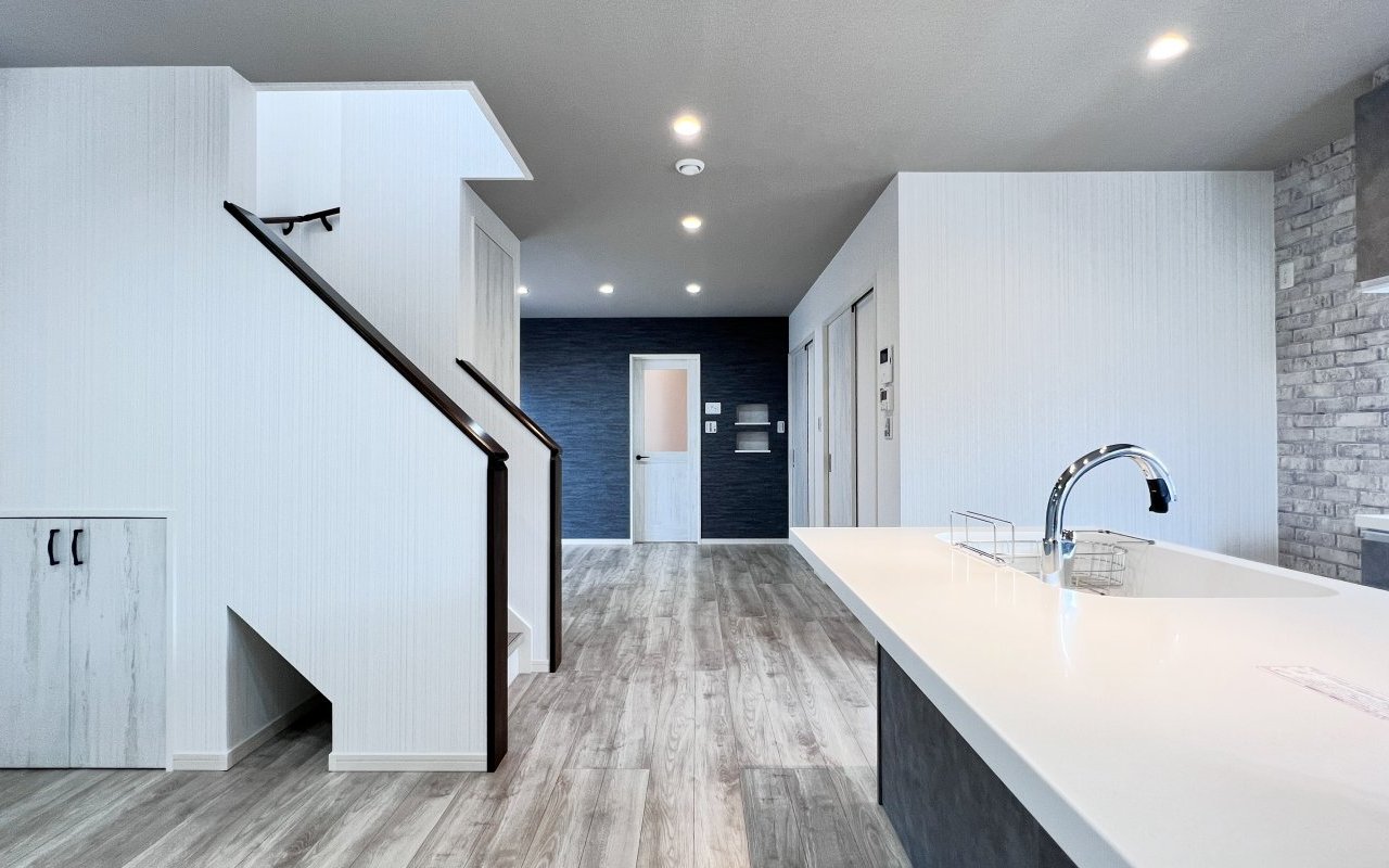 シンプルな白を基調としたクロスに、グレーのキッチンが映えるダイニング。